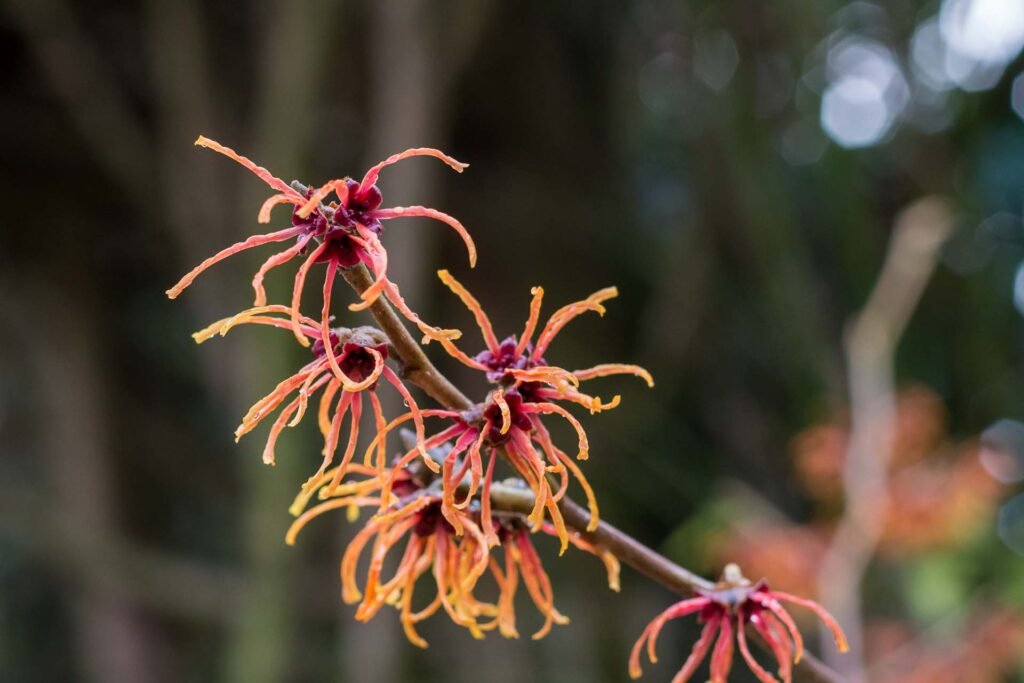• Hamamelis x intermedia also produces its flowers on bare branches in December through to February.  Different varieties produce different flower colours from Pallida’s sulphur yellow to Diane’s coppery-red.