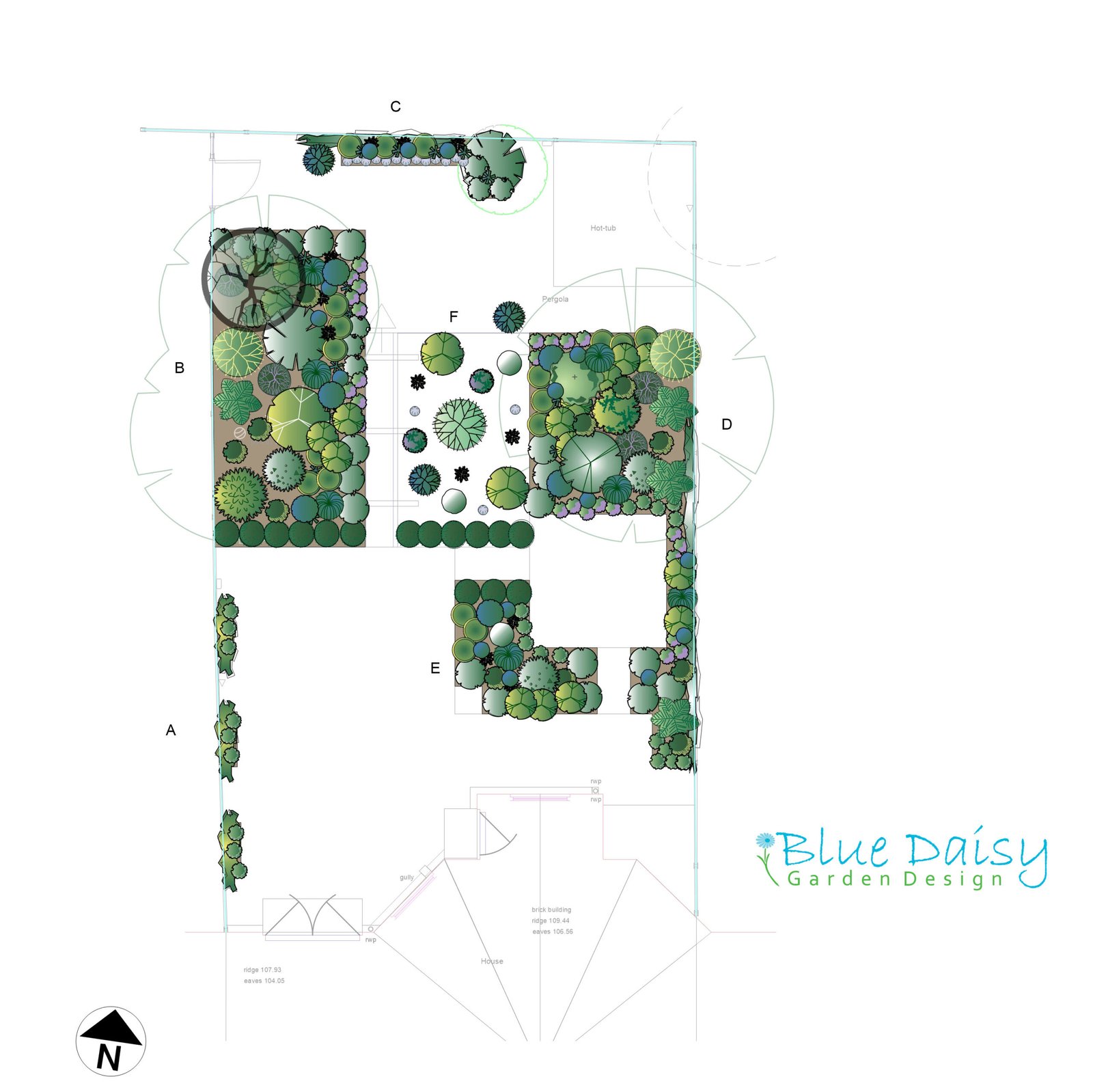We provide and present to you a Planting Design pack which includes in addition to your planting plans, some visuals to help bring your planting scheme to life.  We also provide additional information that includes, but isn't limited to, the key specimens included in your design, your site analysis, planting overview (example shown left) which shows where plants fit in relation to your whole garden, and a plant schedule which is a list that gives the plant names as well as the quantities and pot sizes required to fulfil your planting design.